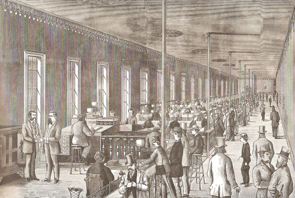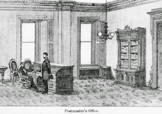 "Postmaster's Office," Interior Views in the New Post Office, Montreal, PQ, by Eugene Haberer, 1876. | Canadian Illustrated News, XIV(20) 313, reproduced from National Library of Canada. |