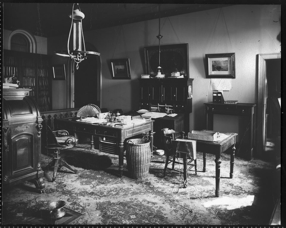 Office of Secretary Spencer Baird (1878-87) in the Smithsonian Institution Building, Washington, DC, created by T. W. Smillie (1843-1917), c. 1878 according to proximate source. At the left is Baird's Wooton desk. | Smithsonian Institution Archives |
