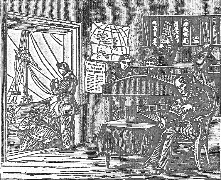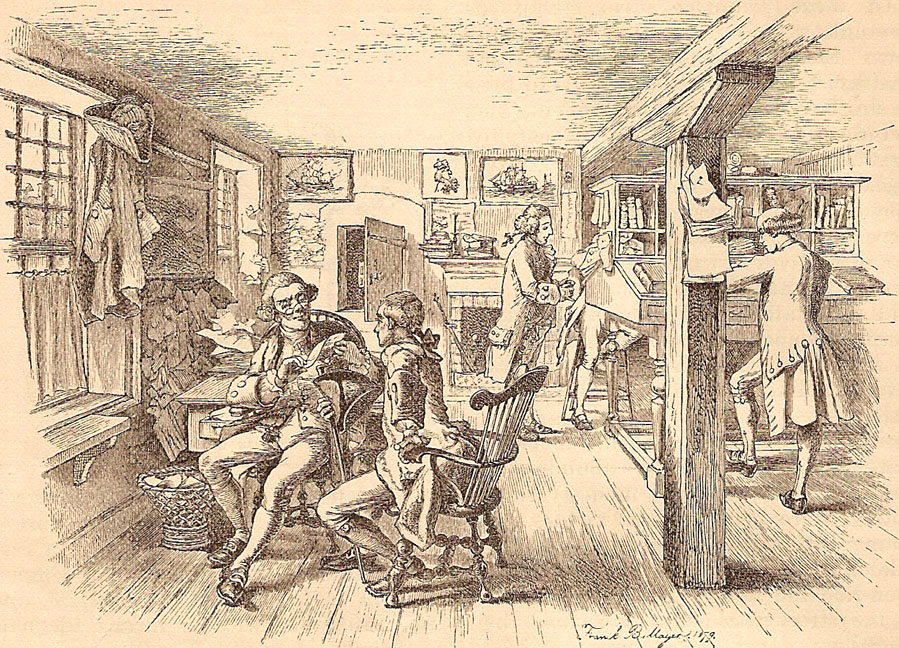 "An Old-Time Counting Room," Fell's Point, Baltimore, MD, c. 1770; drawing dated 1879. "In sight of his ships and his goods, on the ground-floor of his warehouse usually, the old-time merchant had his counting-room. It was separated by a slight partition from the surrounding mass of merchandise. None of the elegance of modern counting-rooms graced the interior. In harmony with the rude beams, an arch of solid masonry supported the safe, built into the walls, and closed by its iron door with a lock to make a modern burglar laugh. From an armchair, as from a throne, the 'head of the house' surveyed a row of deferential clerks at their high desks, almost buried behind their ponderous ledgers. Innumerable bills, ruthlessly impaled on wires, met a deserved fate. Rows of tin or wooden coffers, marked with the names of dead years, rested in dusty security on a high shelf, and suggested long-passed transactions." Referring to the clerks, the article continues: "These youths, whom it was a favor to admit to a great commercial house, were in training as the future merchants and as gentlemen." | "Old Baltimore and Its Merchants," Harper's New Monthly Magazine, Nov. 1880. |