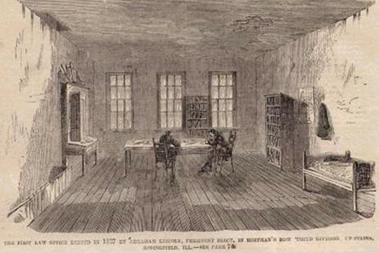 "The Present Law Office of Abraham Lincoln, the President Elect, on Fifth Street, West Side of the Public Square, Springfield, Illinois," engraving, 1860. "Mr. Lincoln's present law office is situated in Fifth street, west side of State Square. He is in partnership with Mr. Herndon, a lawyer of considerable ability and reputation." | Frank Leslie's Illustrated Newspaper, Dec. 22, 1860 |