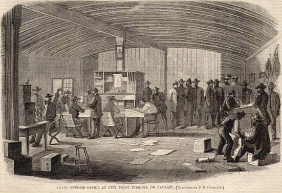 "Adams Express Office at City Point, Virginia, on Pay-Day," engraving by J. R. Hamilton, 1864. Adams Express Co., a competitor of Wells, Fargo & Co., was incorporated in 1854 and was the paymaster for the Union Army during the Civil War. |