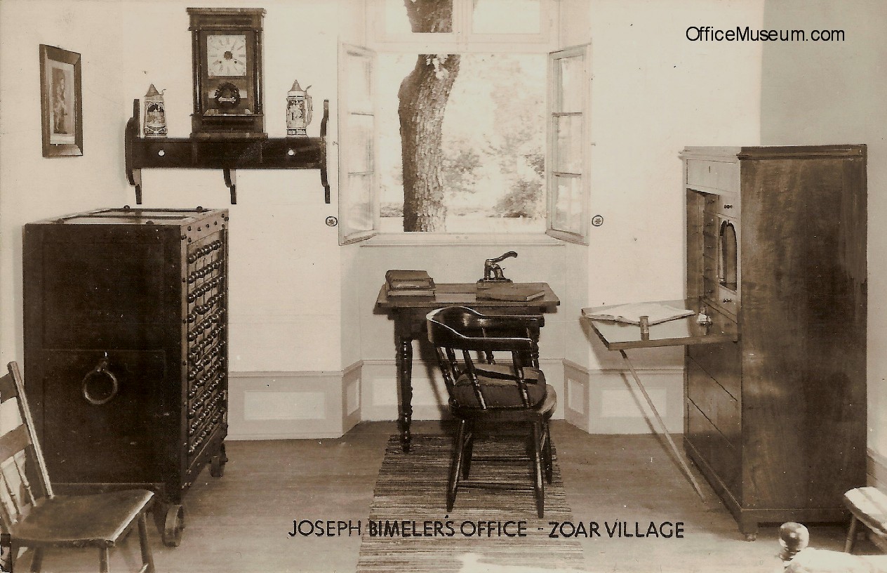 Joseph Bimeler's Office, Zoar Village, OH, reconstruction. Bimeler (1778-1853) was the leader of German separatists, or Zoarites, who came to the US in 1817 and settled in Zoar, OH, where they established a communistic society. The group prospered but during the second half of the 19th century its members lost interest in the original concept. The society was dissolved in 1898. The Ohio Historical Society operates part of the town as an historic site, with restored buildings open to the public. The safe in this photo is similar in appearance to those sold in the US in the 1830s. See our page on safes. | Early Office Museum Archives |