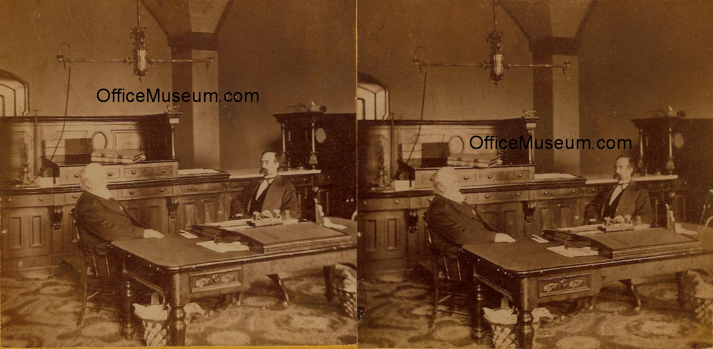 Office with two men, stereoview by R. F. Bowdish, Columbus, OH. This may be the office of a Columbus criminal defense attorney but it is difficult to tell what type of business it actually is from the image. Notice the gas ceiling lighting fixture and the gas line running from the ceiling fixture to a fixture on the counter. Robert F. Bowdish was active as a photographer in Columbus, OH, during at least 1872-82. In 1872 he created a stereoview card showing the senior class at the Ohio Wesleyan Female College, Delaware, OH. (See: http://www.worthpoint.com/worthopedia/stereoview-class-1872-ohio-wesleyan-135674913) In 1882 he created a stereoview card showing elderly people who had been early settlers in Sterling, IL. (See: http://www.idaillinois.org/cdm/ref/collection/stpl/id/995) | Early Office Museum Archives |