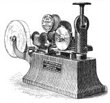 In 1895, the Jones Manufacturing Co. was identified as the successor to the Greenfield Automatic Fastening Co. In 1895 Jones introduced the Greenfield Automatic Pin-Tag Machine (bottom image to right). A pin-tag is a tag that is fastened with a pin or staple to a garment in a retail clothing store. The base of the Pin-Tag machine was similar in design to the base of the Jones Star Paper Fastener (see Strip Stapling Machines) but larger. |